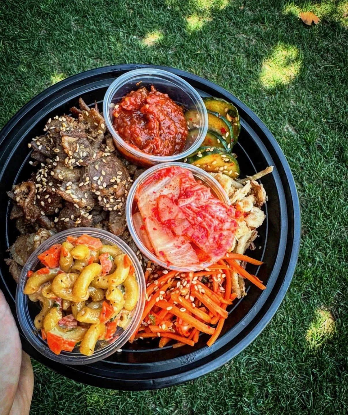 Sticky rice, kimchi, spicy cucumber, marinated shredded carrots, creamy mac salad, crispy onions, and Korean BBQ sauce.